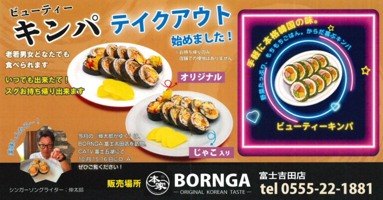 2月2日は節分の日です。ボンガでは、キンパをご予約承ります。ハーフサイズ 5種類盛り合わせ。シーチキン、プルコギ、野菜、キムチ、海老のセット キンパのみ・・・2,800円(税込)オリジナル韓国串おでんセット・・・2,98 […] -